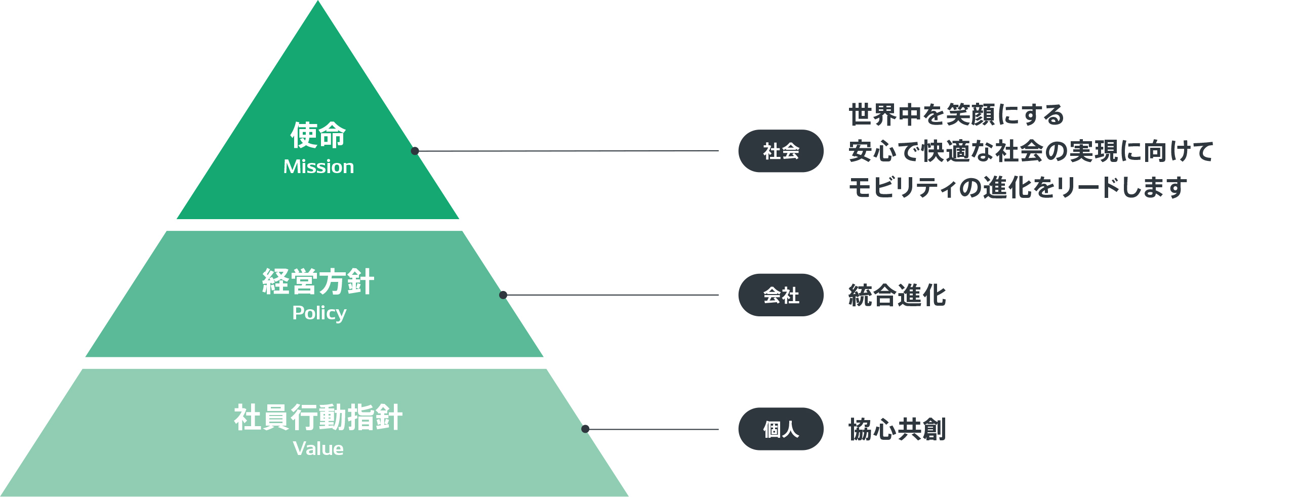 出身会社・取引先・異業種・役職などのすべての壁を越えて、真心から協力し、未来のモビリティをリードします。