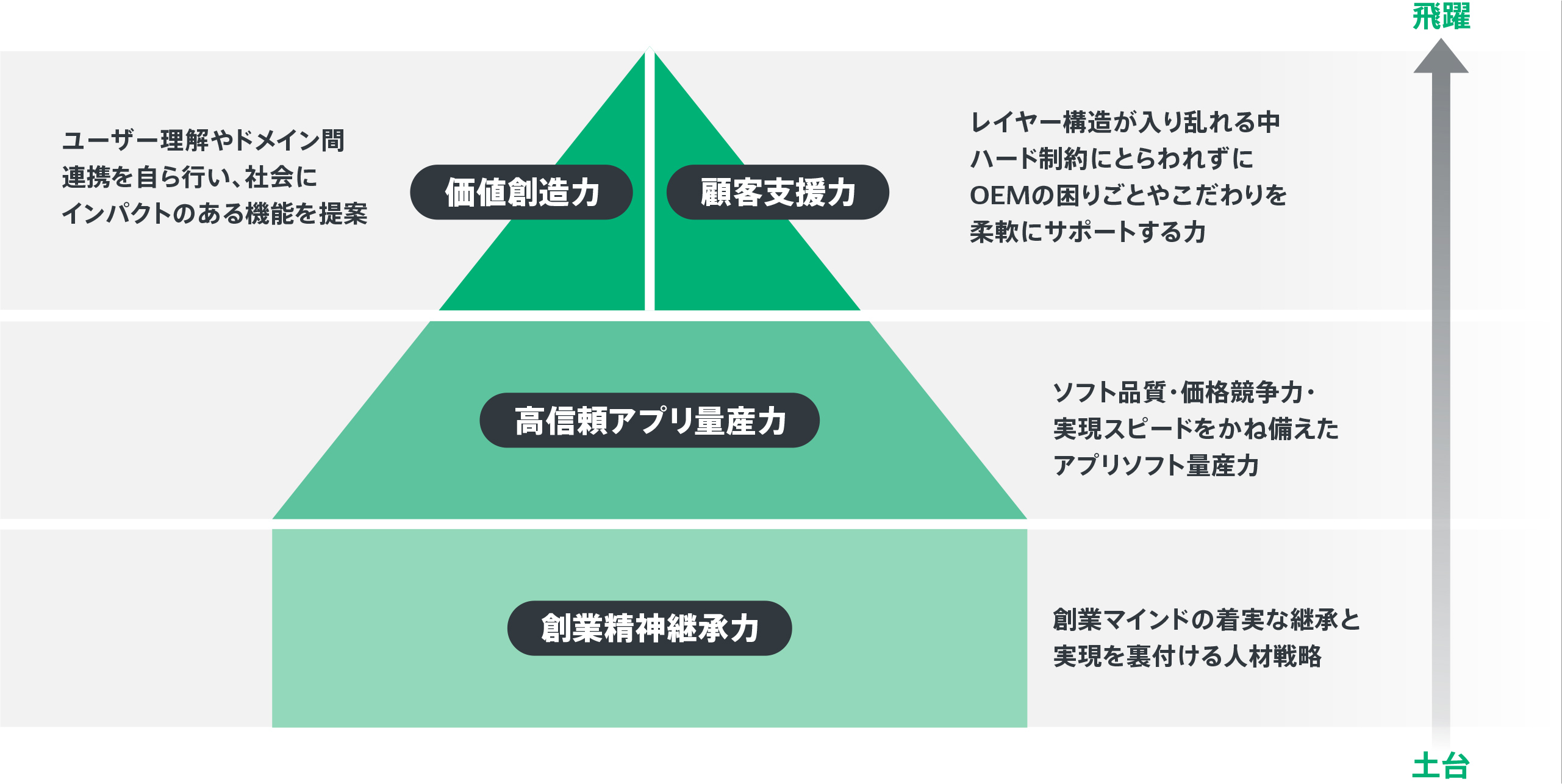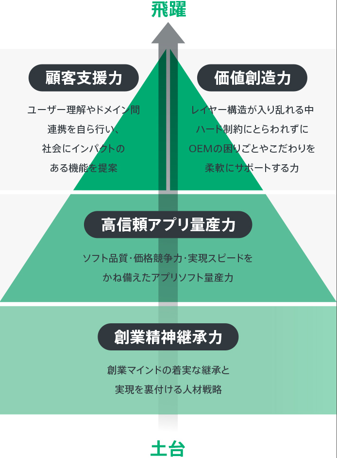 競争力あるアプリケーションを生み出すための3つの武器を「高信頼アプリケーション量産力」「価値創造力」「顧客支援力」、その土台となるカルチャーを「創業精神継承力」と定義し、鍛え上げ、より付加価値の高い自動運転・先進安全運転支援、車両統合制御アプリケーションの開発と普及を通じて良いクルマづくり、スマートなモビリティ社会をけん引していきます。